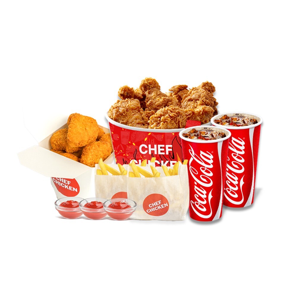 Крылышки 30 шт, наггетсы 20 шт, фри 2 порции, coca-cola, 2 л, соусы 3 шт
