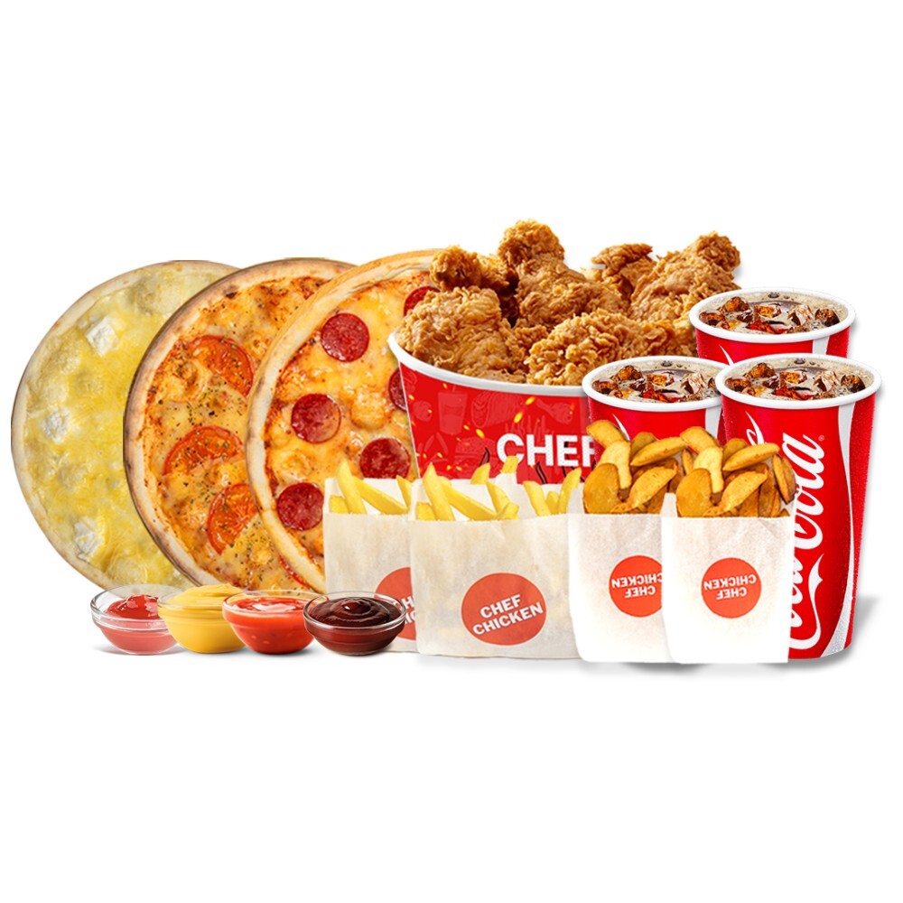 Крылышки 30 шт, coca-cola 3 л, пепперони, маргарита 4 сыра- 1 шт, фри, дольки-2 порции, соусы 4 шт